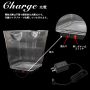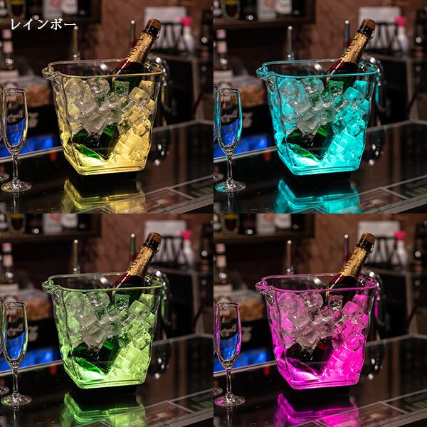 スタッフ 山川より | 光り方を最小限までシンプルにし、スタッキングを可能にすることで より使いやすくリーズナブルになったボトルクーラー サイズは通常サイズのボトルが1本余裕をもって入るサイズです。 ご家庭でも経済的に使っていただいたいので充電式を採用しました。 光る演出で空間や時間を特別なものに。 もっと楽しく、もっとリッチに、もっと華やかに 思い出よりもっと輝く今を。 |