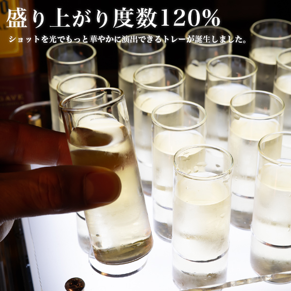 『ここぞ!!』のタイミングでフロアーに振る舞えば 盛り上がり度数120%!! お客さんは楽しすぎてベロベロになること不可避♥ ふわっとホワイトに光るLEDはゴージャスでSNS映え◎ コスパGOODなショットグラスもセットなっていて わざわざトレーに合うグラスを探す手間もありません! 新しいスタイルのショットグラストレーでイベントを 盛り上げちゃいましょう!! |