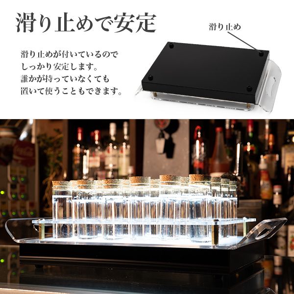 スタッフ 山川より | 運ぶだけのトレーではなく光で演出もでき、 滑り止めで安定しているため滑らず安心です★ 新しいスタイルでショットを盛り上げるトレーの誕生です。