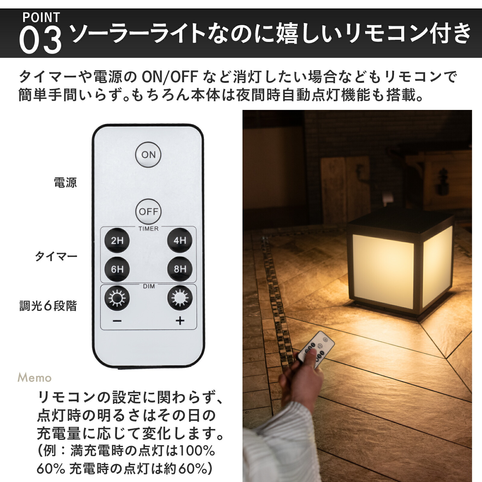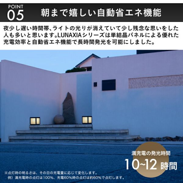 LUNAXIAのオーナーには、そんな手間は必要ありません。 明るさセンサーによるオートスイッチで点灯も消灯も自動で行ってくれます。