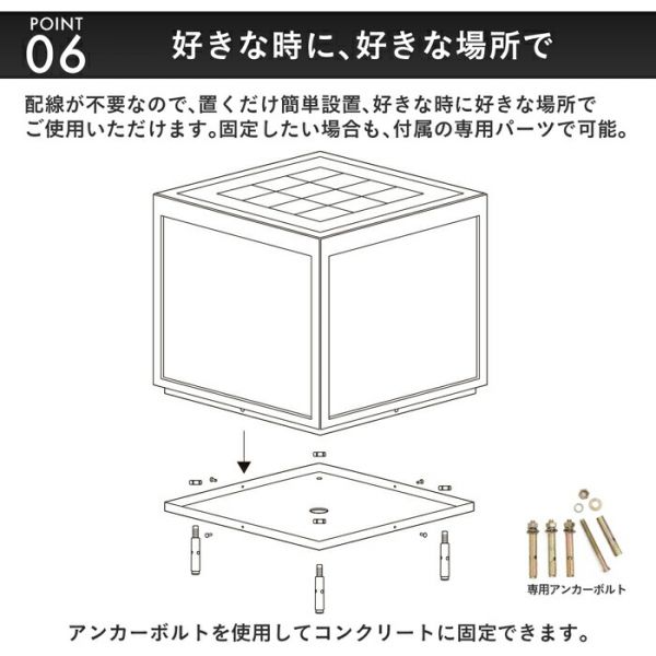 ご注意 付属のアンカーボルトを使ってコンクリートに固定する際は、専門の工具と知識が必要です。設置の際はお近くの施工業者にご依頼ください。