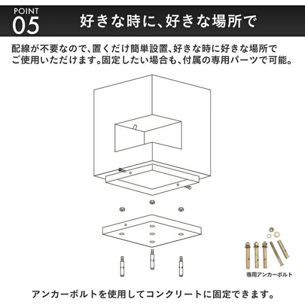 付属のアンカーボルトを使ってコンクリートに固定する際は、専門の工具と知識が必要です。設置の際はお近くの施工業者にご依頼ください。