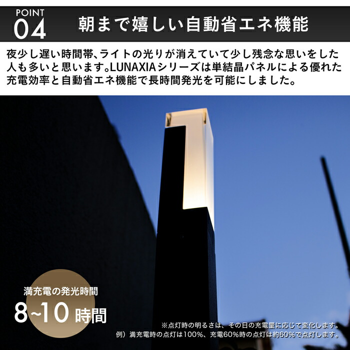 LUNAXIAのオーナーには、そんな手間は必要ありません。 明るさセンサーによるオートスイッチで点灯も消灯も自動で行ってくれます。